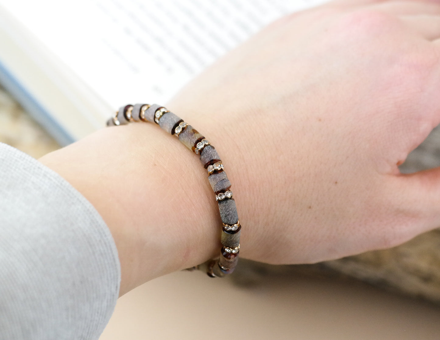 Bracelet is strung on elastic string.