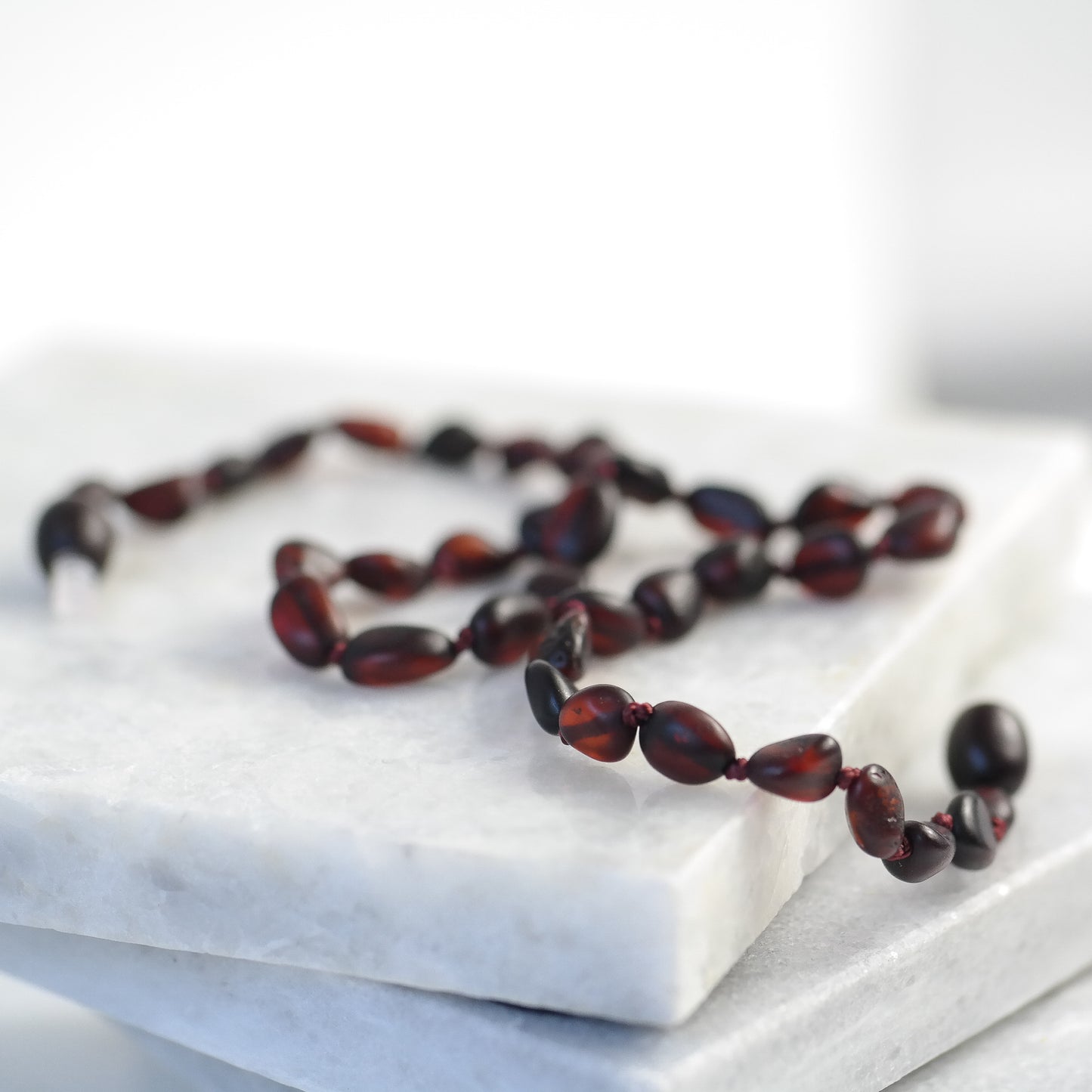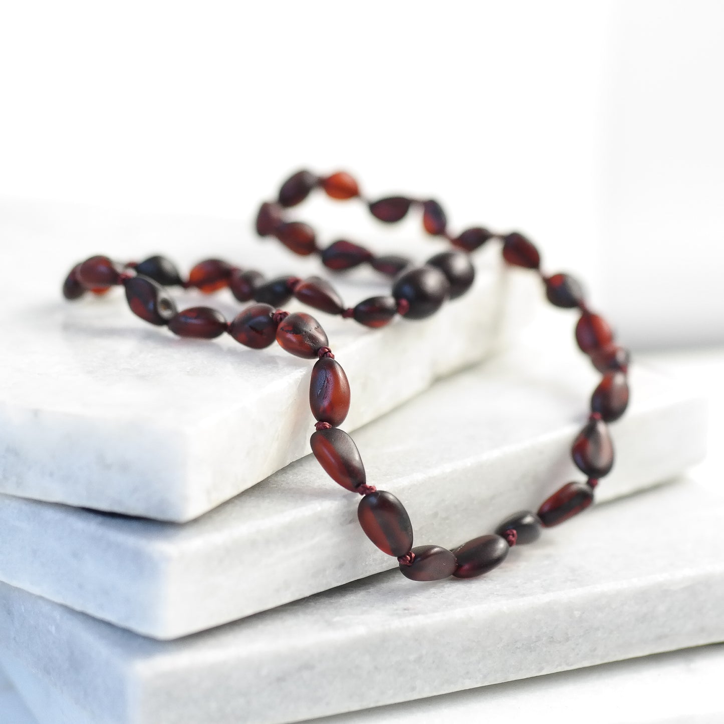 Handmade natural Baltic amber necklace made of bean shaped amber beads. Knotted between each bead for safety, combined with screw clasp.