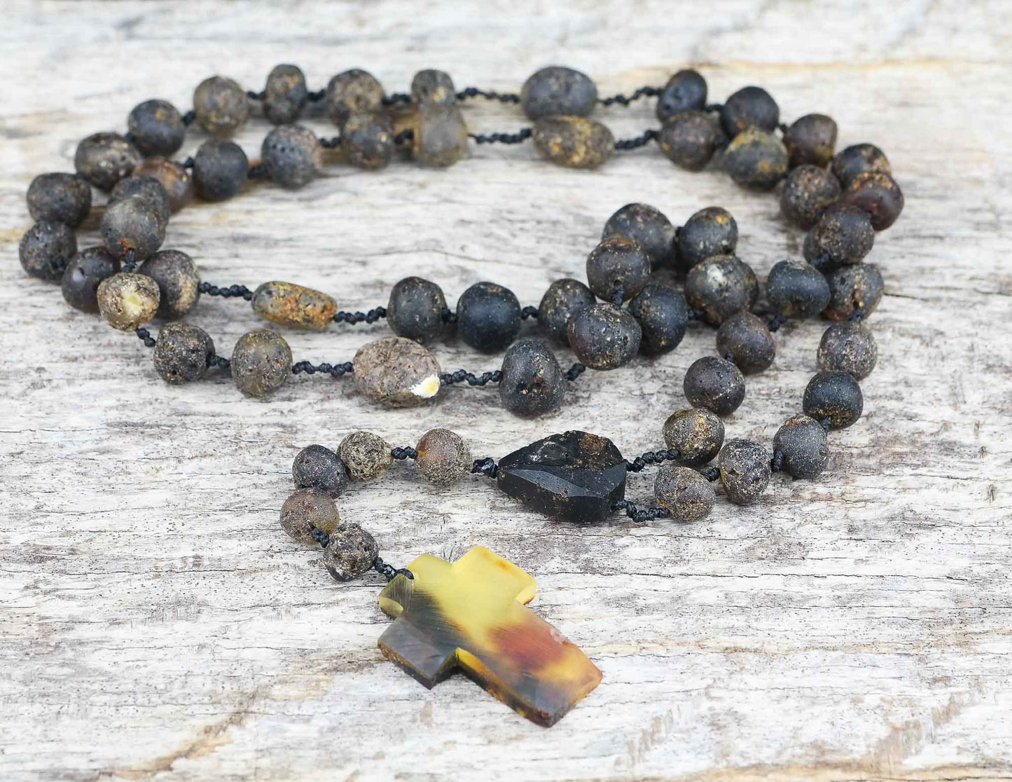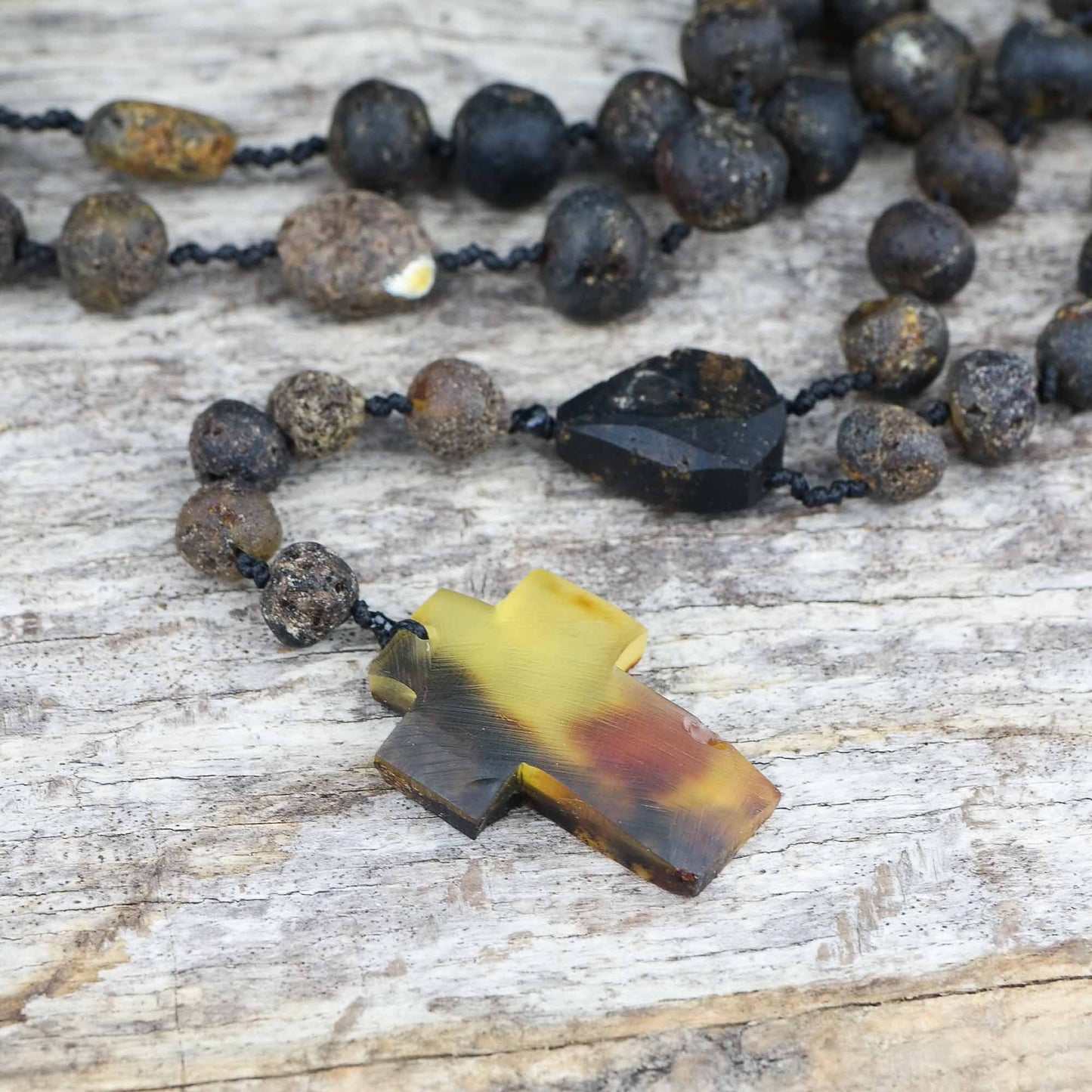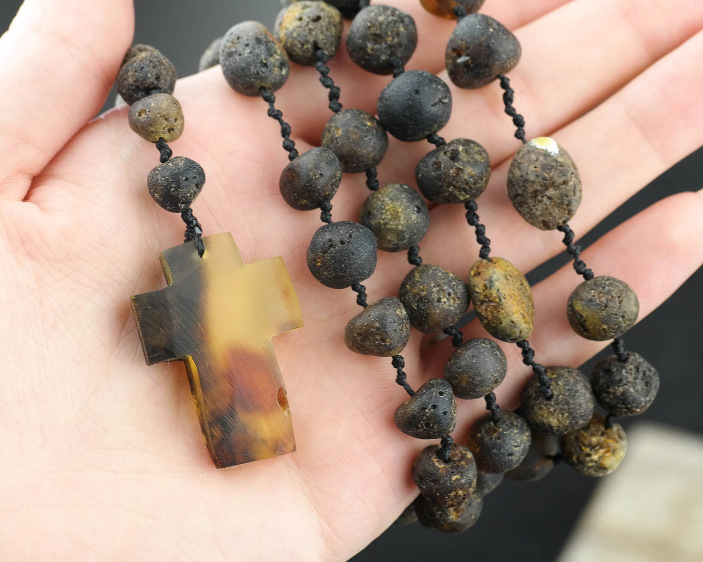 Handmade natural Baltic amber rosary made of baroque shaped amber beads. Knotted in between each bead for the safety.