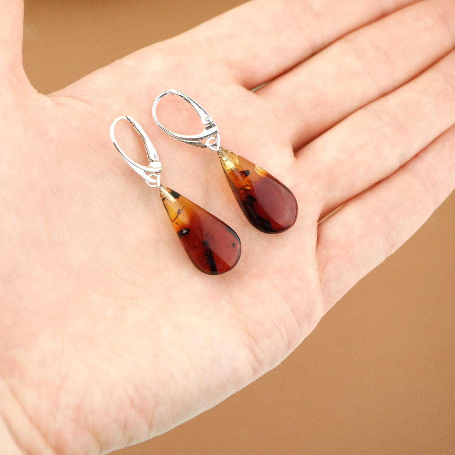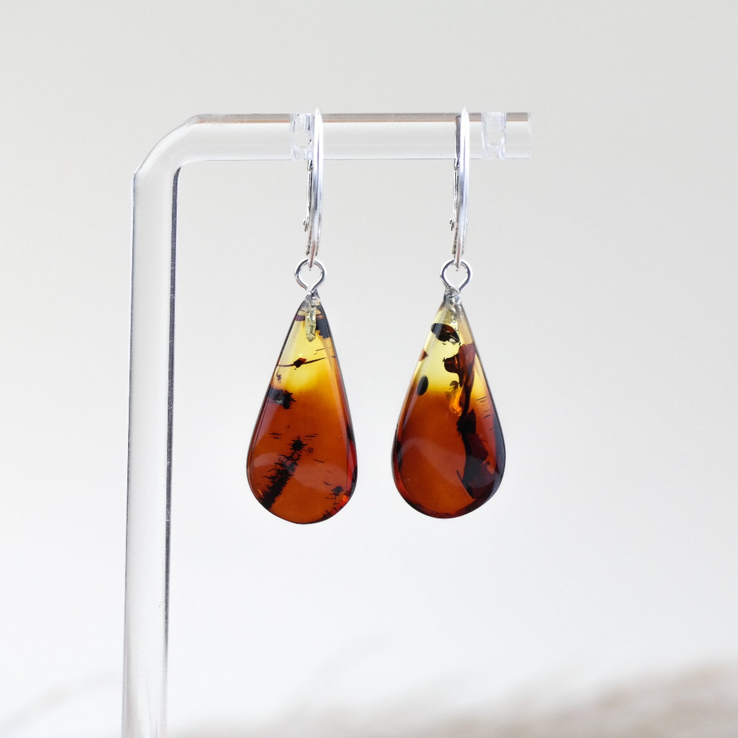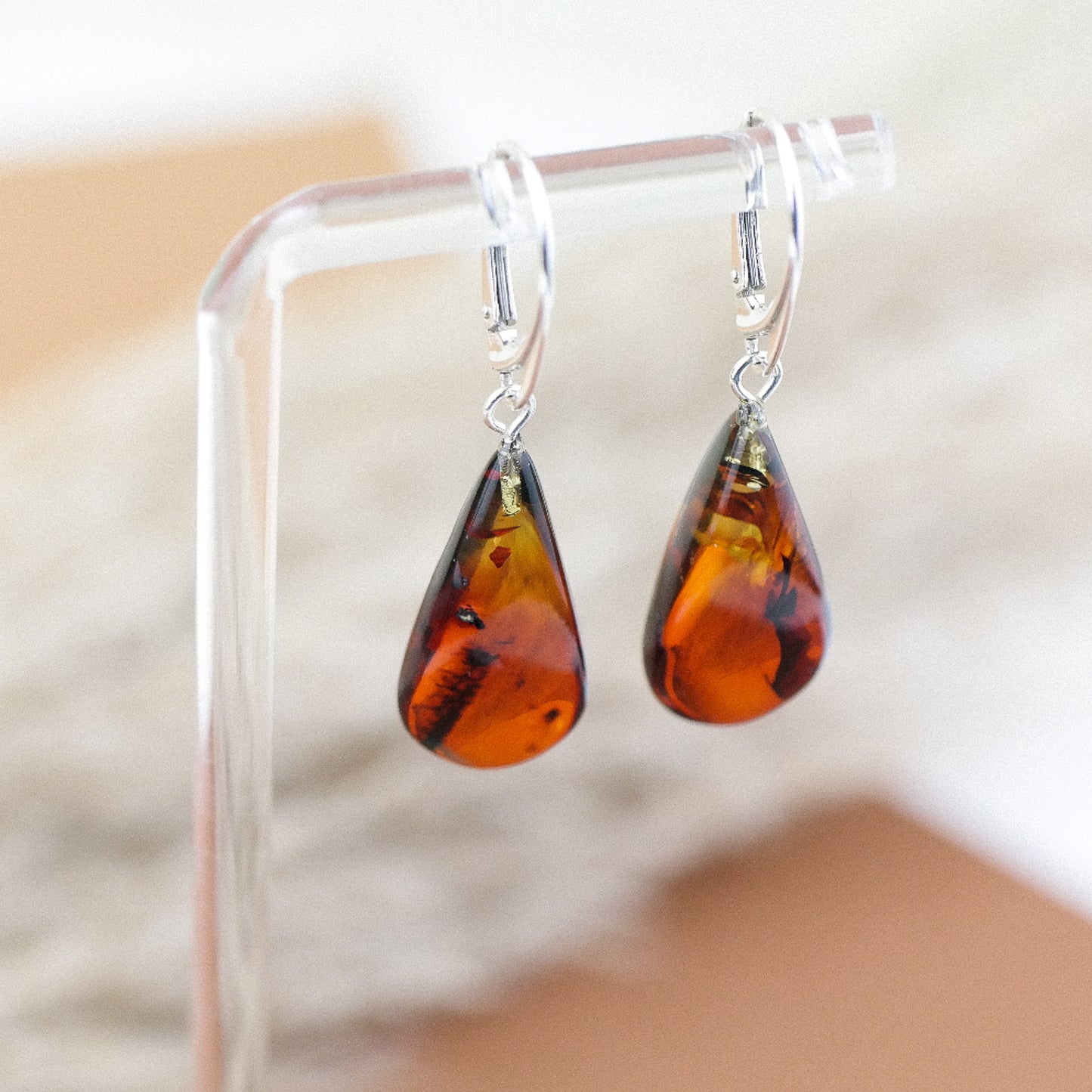 Women drop earrings made of cognac colour, drop shaped natural amber beads. Each amber bead is unique. Perfect for those who appreciate unique and natural jewellery.